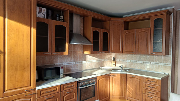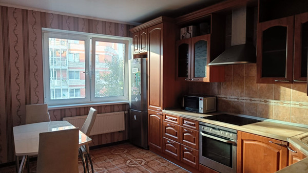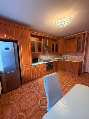 Кухня оборудована качественной мебелью и современной техникой: посудомоечная машина, микроволновая печь, варочная поверхность, духовка, холодильник.