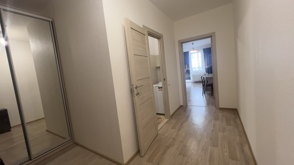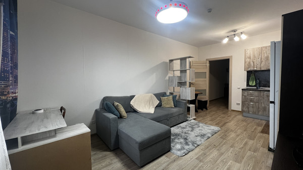Студия имеет отделку с современными материалами:— полный комплект сантехники в санузле со стиральной машинкой— выделенная кухонная зона— выделенная зона отдыха с раскладным диваном— большой коридор площадью 8,6 м2 со встроенным шкафом купе— огромная лоджия 4 метра— межкомнатные двери с фурнитурой и двухкамерные стеклопакеты.