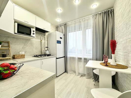 Есть всё необходимое для комфортного проживания.На кухне новая мебель, холодильник, газовая панель с электроподжигом и автоматическим отключением, микроволновая печь, вытяжка на пульте управления. Также, для комфортного начала жизни в квартире есть и посуда.
