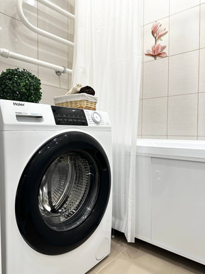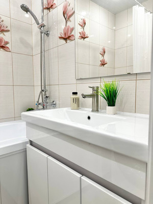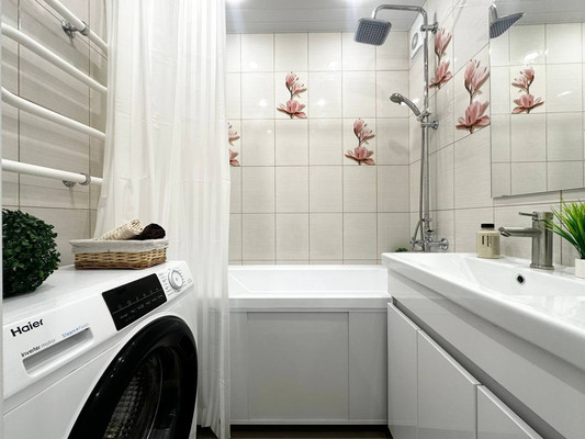 В сан.узле установлен тропический душ с температурным датчиком.Стиральная машинка, ванна и раковина - новые.