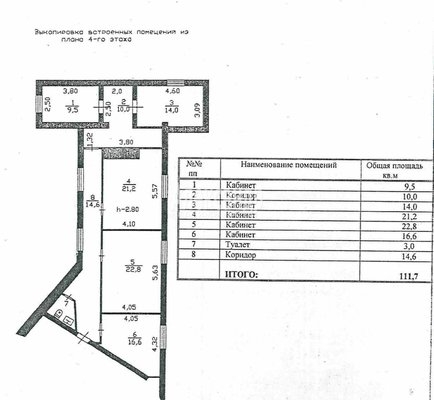 Помещение размещается на четвертом этаже. Имеет 5 полноценных кабинетов (полезная площадь 84 кв.м.) с большими панорамными окнами. Установлено видеонаблюдение.
