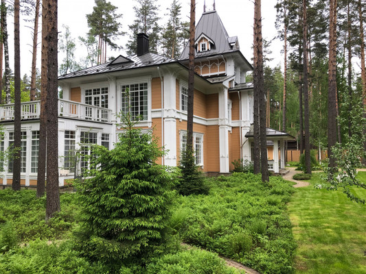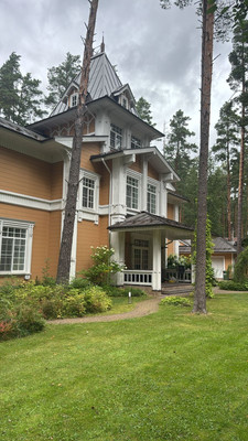 ⁃ Эксклюзивный, просторный дом в 503м2, проект которого, под названием «Дом с мезонином» - занял 1ое место в Международном архитектурном конкурсе «Красивые деревянные дома 2013».Дом сделан из клеенного бруса максимального размера. Имеет высокие потолки (более 3 метров), хорошо продуманную планировку. На первом этаже расположены: ⁃ кухня с «холодной комнатой» для хранения продуктов и утвари. Кухня оборудована всей необходимой техникой, включая встроенную кофемашину и измеритель отходов ⁃ просторная гостиную с шикарным центральным дровяным камином и с обеденной зоной и зоной для просмотра телевизора ⁃ из гостиной можно пройти на светлую застекленную террасу с выходом на площадку для гриля ⁃ так же на первом этаже расположены: просторная прихожая зона с гардеробной, проходная сушилка, проход в гараж на 2 машины и гостевой санузел.На втором этаже расположена: ⁃ мастер-спальня с собственной шикарной террасой; просторным санузлом с огромной джакузи, душевой, биде, писсуар и раковиной для двоих; с выходом в собственную гардеробную ⁃ три спальни, одна из которых сделана как детская и имеет собственный балкон. ⁃ кабинет ⁃ два сан узла с ванной и дешевыми ⁃ постирочная В мезонине расположена отдельная комната, с возможностью проходом на чердачное пространство и подъема на башню.