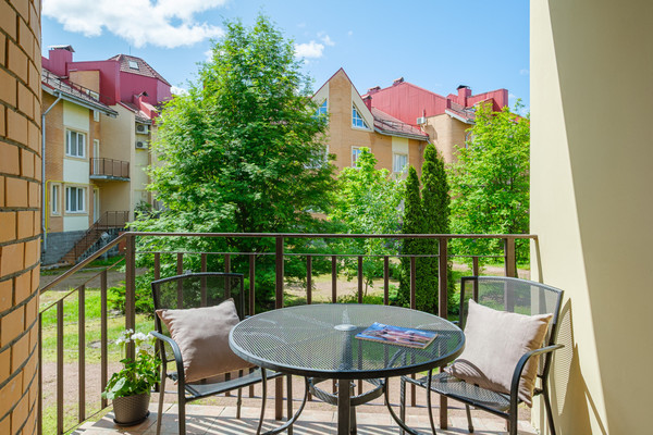 1 этаж – кухня (вся техника Electrolux)- гостиная 53,4 кв.м с действующим дровяным камином, гостевой санузел и выход на уютную террасу во внутреннем закрытом дворе, утопающем в зелени. Кондиционеры Mitsubishi.