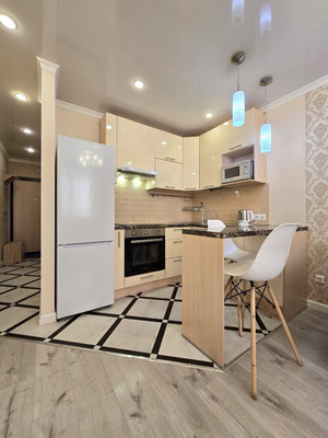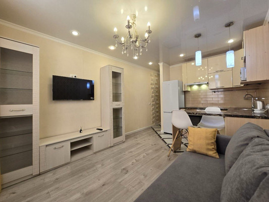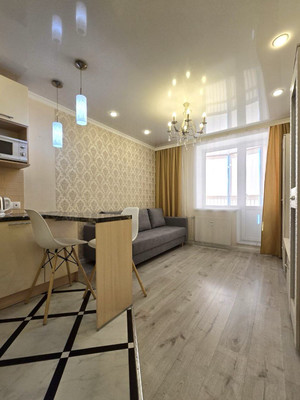 ПРО КВАРТИРУ: Квартира расположена на комфортном 12-м этаже. Окна смотрят в тихий двор.В просторной прихожей встроен шкаф-купе, имеется обувница, вешалка для верхней одежды в комод. Санузел совмещенный, но просторный и удобный. Комната ОТЛИЧНО зонирована на кухню и гостиную при помощи барной стойки. Вся мебель и техника практически новые. Из комнаты есть выход на просторную лоджию. Квартира оснащена всем необходимым для проживания:- раскладной диван;- кухонный гарнитур;- варочная панель;- духовка;- вытяжка;- микроволновая печь;- телевизор;- холодильник;- шкаф;- стиральная машинка;- чайник электрический;- утюг;- роутер для интернета;- посуда.