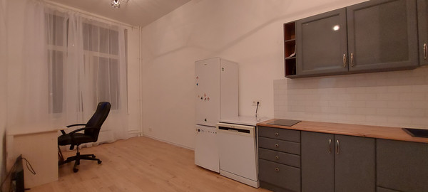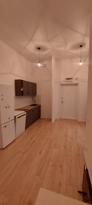 О квартире:-Квартира сдаётся впервые. Никто не жил.-Квартира светлая, тёплая, чистая располагается на 1-м этаже 15-ти этажного дома.-В квартире произведена качественная светлая отделка от застройщика: входная металлическая дверь, ламинат и обои под покраску во всей квартире, плитка на полу и стенах в санузле + установка всей сантехники, счетчики электроснабжения, горячей и холодной воды, двухкамерные панорамные стеклопакеты, радиаторы с терморегуляторами.-Общая площадь-34 м2, изолированные комната - 12м2 и кухня-гостиная - 18м2, просторный санузел совмещённый в кафеле.-Очень высокие потолки 3,7м. придают квартире дополнительный объём и комфорт.-Качественная входная металлическая дверь. Установлен домофон.-Площадка перед квартирой закрыта. Всего две квартиры на площадке.-Квартира меблирована. Мебель: кухонный гарнитур с встроенной мойкой, стол, кресло, 2-х дверн.шкаф, большая 2-х спальная кровать с матрацем. Бытовая техника: варочная панель, эл.вытяжка, холодильник, стиральная и посудомоечная машины, телевизор.-Интернет на выбор (есть несколько провайдеров).