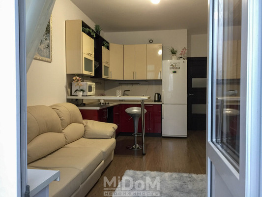 КВАРТИРА: 16 этаж, окна на юго-восток. В теплое время года (май-август) в квартире светло и солнечно, но не жарко благодаря лоджии. Комната полностью оснащена и как спальня и место для отдыха. Диван на фото будет заменён перед заездом на новый, есть большой шкаф, кухонный гарнитур, барная стойка, барный стул. К комнате примыкает просторная лоджия со стеллажом и шкафом. Кухня оснащена необходимой для проживания техникой. Микроволновая печь. Ванная оборудована стиральной машиной. В прихожей шкаф и вешалка для одежды.