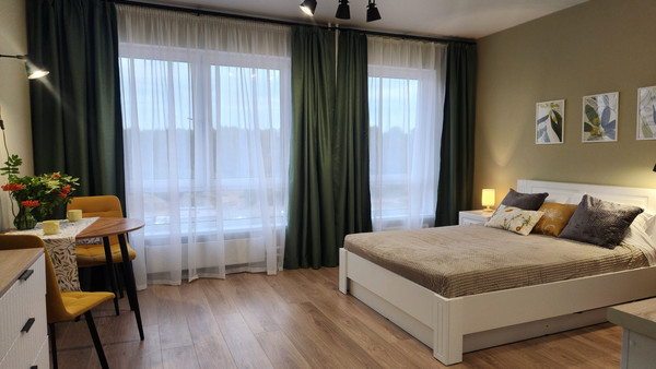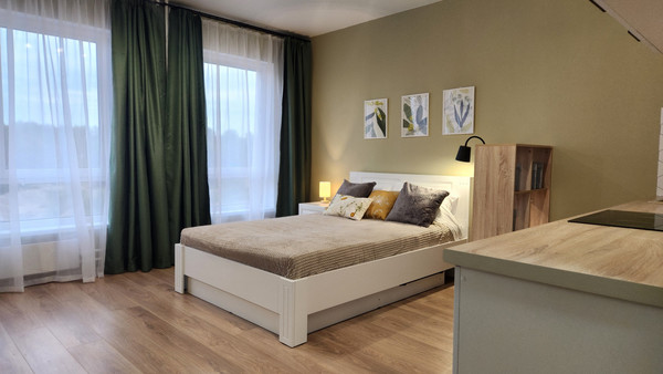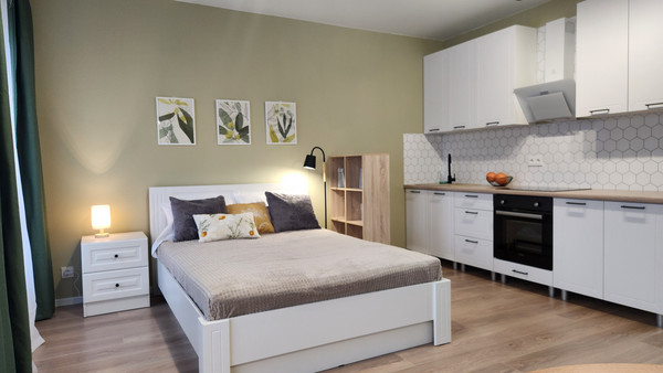Студия увеличенной площади, очень светлая и тихая.Окна квартиры выходят во двор внутренней территории, открывается красивый вид.