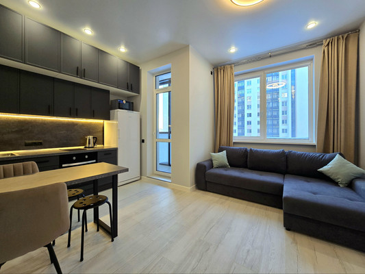 ПРО КВАРТИРУ:Квартира после ремонта в ИДЕАЛЬНОМ состоянии. Зона кухни отделена от остального пространства высоким барным столом. Квартира находится на комфортном ЧЕТВЕРТОМ этаже и имеет выход на ПРОСТОРНЫЙ застекленный балкон с видом во двор. Квартира полностью УКОМПЛЕКТОВАНА всем необходимым для КОМФОРТНОГО проживания. В Вашем распоряжении: холодильник, плита, духовая печь, стиральная машина, раскладной диван и другое.
