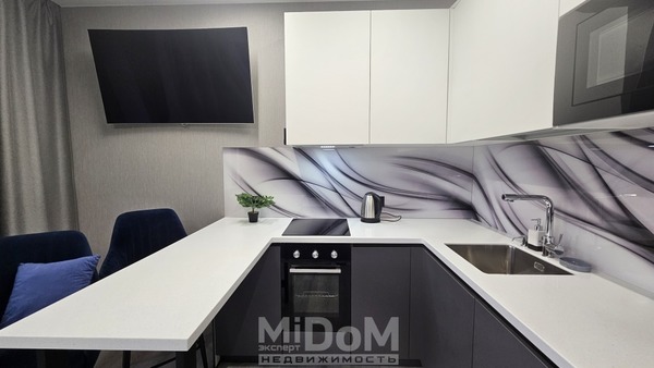 В зоне приготовления еды Вас будут ждать: кухонный гарнитур, холодильник, электрический чайник, микроволновая печь, варочная панель, духовой шкаф, барная стойка и 2 барных стула.