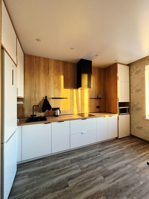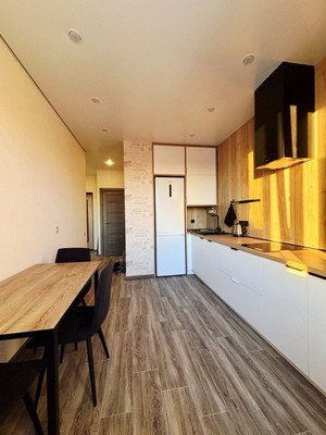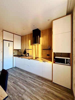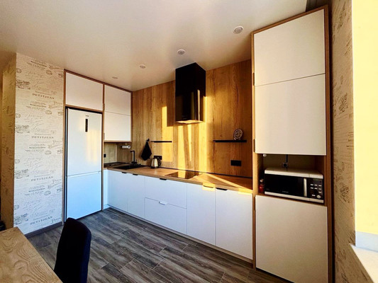 Общая площадь – 37 кв. м, кухня – 12 кв. м, высота потолков — 2,8 м;