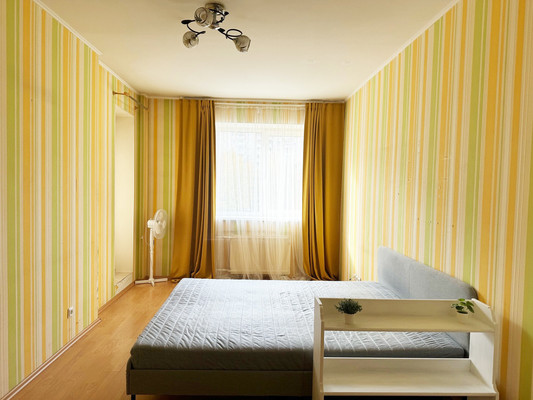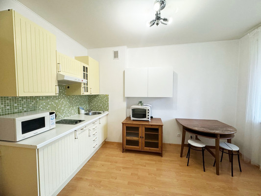 Оснащена всем необходимым для комфортного проживания: новый холодильник (на фото нет), стол, стулья, варочная панель, стиральная машина, микроволновая печь, духовой шкаф, диван, двуспальная кровать, большой вместительный шкаф купе. Окна квартиры выходят во двор. Есть застекленная лоджия.