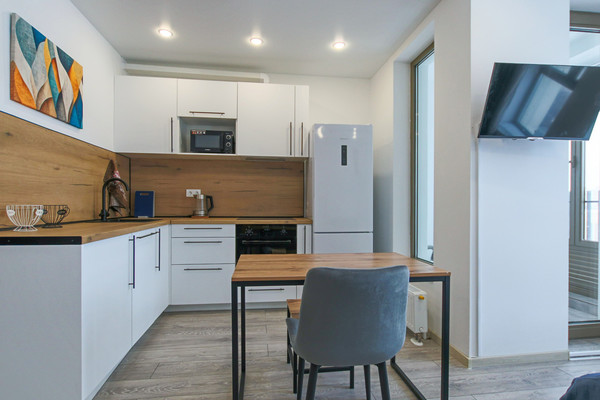 А также : кровать с качественным ортопедическим матрасом, комплект постельного белья, полотенце, посуда, гладильная доска, утюг, чайник.Подключен интернет, фильтр для питьевой воды.Панорамные окна выходят на восточную сторону света.