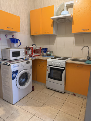 В кухонной зоне установлена новая электрическая плита, стиральная машинка, холодильник, вытяжка и микроволновка. Посуда и столовые приборы в достаточном количестве.