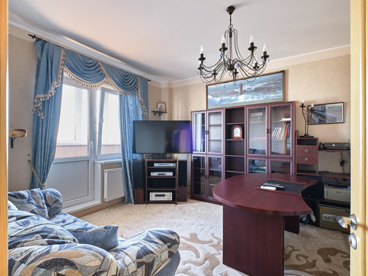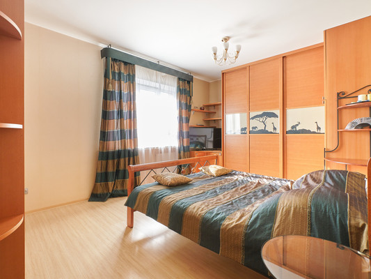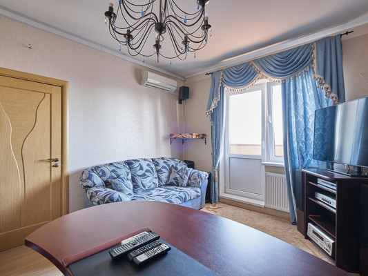 Мебель: В наличии три вместительных шкафа-купе для хранения вещей. Двухспальная кровать. Диван с полноценным спальным местом. Кухня оборудована всем необходимым, есть базовый набор посуды.