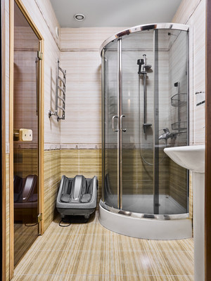 1 этаж – Гараж с воротами на дистанционном приводе, в гараже проведена вода и канализация. Прихожая, комната отдыха с сауной, санузлом и выходом на приватную террасу, с живой изгородью из туй с мангальной зоной.