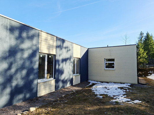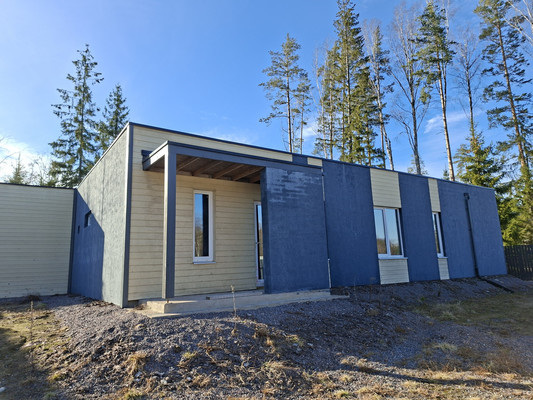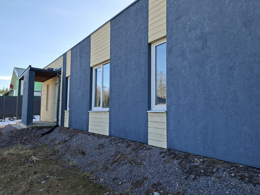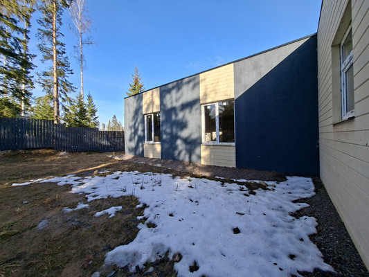 Отделка фасада выполнена в Скандинавском стиле, штукатурка графитового цвета с деревянными акцентами песочного оттенка гармонично сочетается с окружающим ландшафтом.Коммуникации:Электричество 15 Квт. Вода - своя скважина.Канализация – септик. Дом построен из газобетона на ленточном фундаменте. Общая площадь 138м2, жилая 94.39 м2. Комнаты: просторная кухня-гостиная 42,85м2 (5 окон с видом на лес), три спальни (10,33+14,74+11,38м2), кабинет 15,09м2, два санузла, сауна, постирочная, гардероб и бойлерная. Отсутствие внутренней отделки позволяет Вам воплотить в жизнь любые дизайнерские решения!