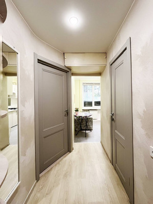 В квартире полностью сделан качественный ремонт: вскрыты и залиты полы, поменяна электропроводка, трубы, батареи, установлены качественные стеклопакеты, в комнате и коридоре сделаны натяжные потолки, выровнены стены, уложен качественный ламинат высокой прочности, установлена новая газовая колонка, прочная входная дверь (хорошая шумоизоляция) и новые межкомнатные двери.