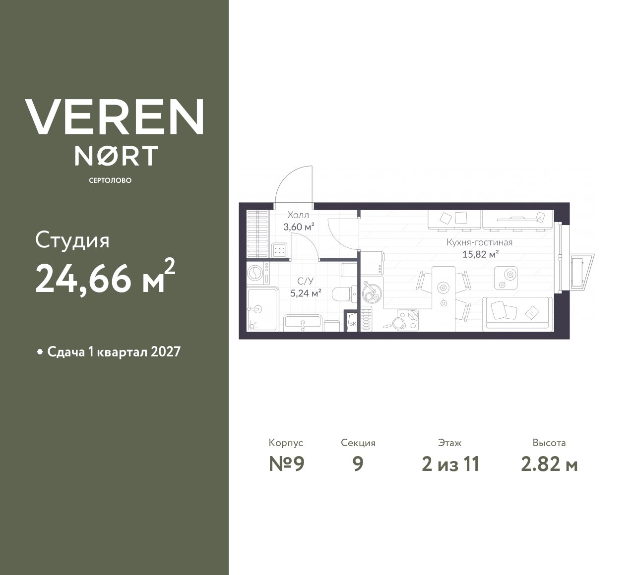 Спешите оформить бронирование на этих условиях! Период предложения ограничен! Стоимость квартиры указана со скидкой, ваша экономия составит 441,049 RUB. Звоните, наши менеджеры вам все расскажут! Просторная однокомнатная квартира-студия в Veren Nort Сертолово на 2 этаже. Квартира без отделки, после выдачи ключей можно делать ремонт. Общая площадь: 24.66 кв.м., площадь гостиной 15.82 кв.м., из которых 5 кв.м. выделено под кухонную зону. Все окна выходят на одну сторону. В квартире один совмещенный санузел. Высота потолков 2.82 м. Квартира находится в корпусе 9. Дом монолитный, одноподъездный, высотой 11 этажей. На этаже 14 квартир. В подъезде 1 пассажирский и 1 грузовой лифт. Окончание строительства - 4 квартал 2026 года. Оформление сделки по договору долевого участия. Вид на приватный двор. Сочетание современной архитектуры и отличной экологии севера Лен. области. Выразительный облик домов разработан именитым архитектурным бюро «Остоженка». Характеристики жилого комплекса исключительны: продуманный ландшафтный дизайн, оригинальные парадные, разработанные по индивидуальному дизайн-проекту, современные детские и многофункциональные спортивные площадки, летний кинотеатр под открытым небом, два детских сада. Комплекс создается в уже сложившейся инфраструктуре г. Сертолово и обладает удобным транспортным сообщением с Санкт-Петербургом. В 300 метрах от «VEREN NORT сертолово» планируется транспортно-пересадочный узел «Сертолово», который обеспечит удобную железнодорожную связь с Финляндским вокзалом Санкт-Петербурга. (AQID02417877)