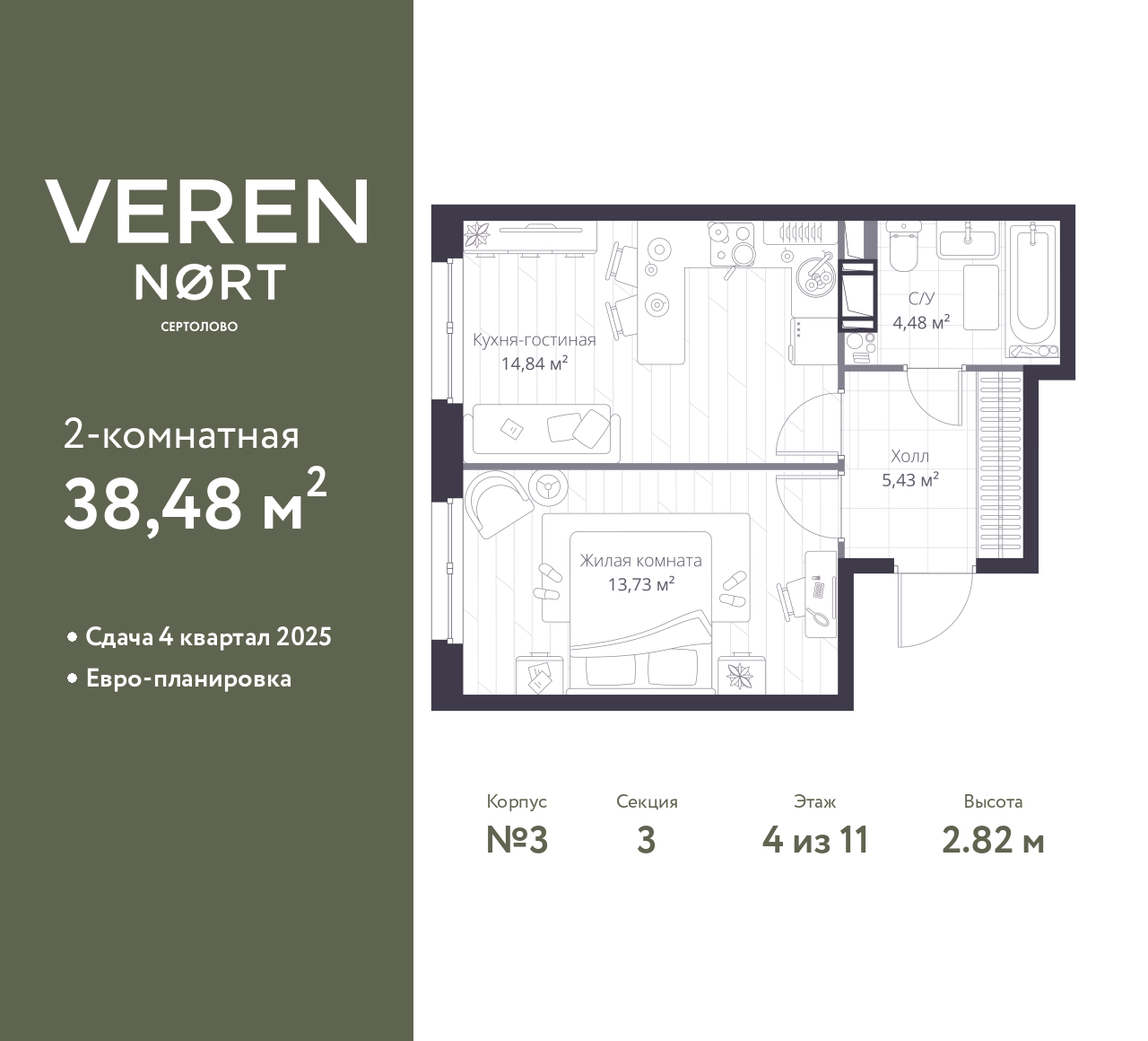 Торопитесь оформить бронирование, пока действует скидка! Предложение ограничено! Стоимость квартиры указана со скидкой, ваша экономия составит 1,932,817 RUB. Звоните, мы вам все подробно расскажем! Продается 1-комн. квартира от застройщика в Veren Nort Сертолово на 4 этаже. Квартира без отделки, полностью готова к чистовой отделке и дальнейшему ремонту. Общая площадь: 38.48 кв.м., жилая: 13.73 кв.м., площадь просторной куxни-гостиной: 14.84 кв.м. Все окна выходят на одну сторону. В квартире один совмещенный санузел. Высота потолков 2.82 м. Квартира находится в корпусе 3. Дом монолитный, одноподъездный, высотой 11 этажей. На этаже 6 квартир. В подъезде 1 пассажирский и 1 грузовой лифт. Начало строительства - 3 квартал 2023 года. Окончание строительства - 4 квартал 2025 года. Оформление сделки по договору долевого участия. Евро-планировка, вид на приватный двор. Сочетание современной архитектуры и отличной экологии севера Лен. области. Выразительный облик домов разработан именитым архитектурным бюро «Остоженка». Характеристики жилого комплекса исключительны: продуманный ландшафтный дизайн, оригинальные парадные, разработанные по индивидуальному дизайн-проекту, современные детские и многофункциональные спортивные площадки, летний кинотеатр под открытым небом, два детских сада. Комплекс создается в уже сложившейся инфраструктуре г. Сертолово и обладает удобным транспортным сообщением с Санкт-Петербургом. В 300 метрах от «VEREN NORT сертолово» планируется транспортно-пересадочный узел «Сертолово», который обеспечит удобную железнодорожную связь с Финляндским вокзалом Санкт-Петербурга. (AQID02411670)