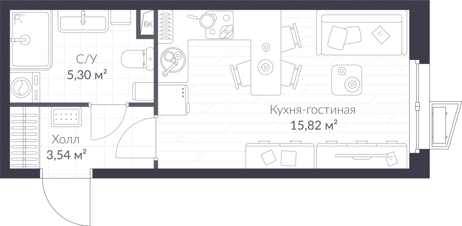 - Общая площадь 24.66 м²