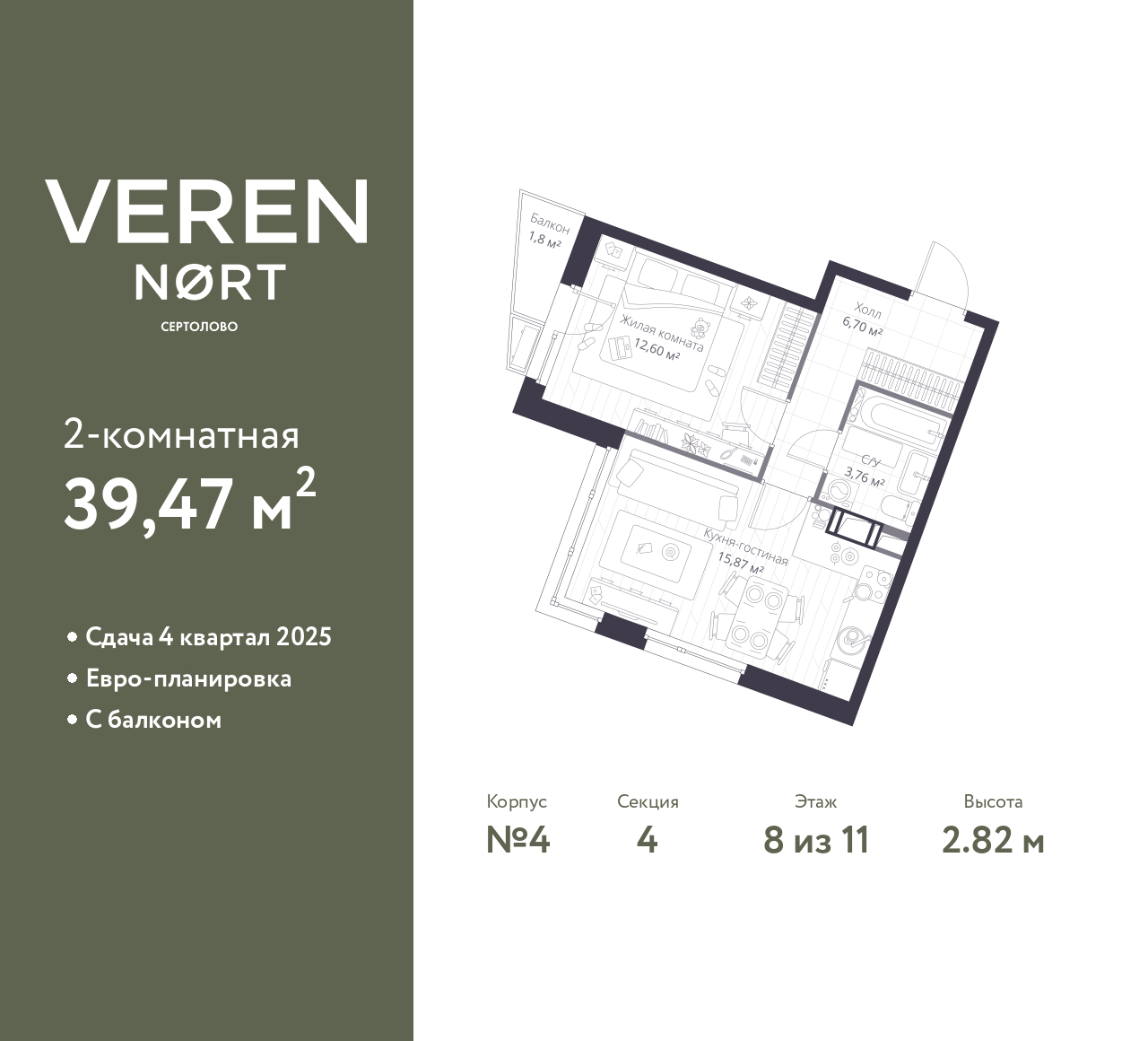 Торопитесь забронировать по этой цене! Срок акции ограничен! Стоимость квартиры указана со скидкой, ваша экономия составит 2,082,173 RUB. Информация по телефону, мы вам все подробно расскажем! Продается 1-комн. квартира в Veren Nort Сертолово на 8 этаже. Квартира без отделки, новый собственник может сделать ремонт по своему дизайн-проекту. Общая площадь: 39.47 кв.м., жилая: 12.6 кв.м., площадь просторной куxни-гостиной: 15.87 кв.м. Квартира угловая, очень светлая, естественная вентиляция при открытии окон. В квартире один балкон, один совмещенный санузел. Высота потолков 2.82 м. Квартира находится в корпусе 4. Дом монолитный, одноподъездный, высотой 11 этажей. На этаже 14 квартир. В подъезде 1 пассажирский и 1 грузовой лифт. Начало строительства - 3 квартал 2023 года. Окончание строительства - 4 квартал 2025 года. Оформление сделки по договору долевого участия. С балконом, евро-планировка, вид на приватный двор. Сочетание современной архитектуры и отличной экологии севера Лен. области. Выразительный облик домов разработан именитым архитектурным бюро «Остоженка». Характеристики жилого комплекса исключительны: продуманный ландшафтный дизайн, оригинальные парадные, разработанные по индивидуальному дизайн-проекту, современные детские и многофункциональные спортивные площадки, летний кинотеатр под открытым небом, два детских сада. Комплекс создается в уже сложившейся инфраструктуре г. Сертолово и обладает удобным транспортным сообщением с Санкт-Петербургом. В 300 метрах от «VEREN NORT сертолово» планируется транспортно-пересадочный узел «Сертолово», который обеспечит удобную железнодорожную связь с Финляндским вокзалом Санкт-Петербурга. (AQID02411685)