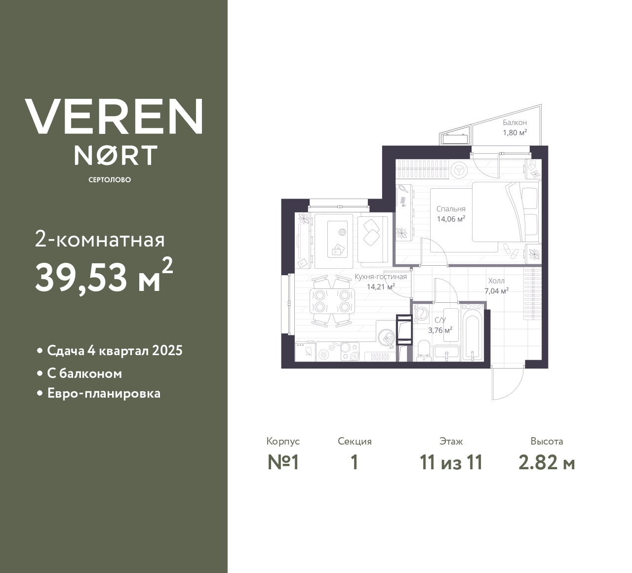 Спешите забронировать на этих условиях! Предложение ограничено! Стоимость квартиры указана со скидкой, ваша экономия составит 2,871,612 RUB. Информация по телефону, мы вам все подробно расскажем! 1-комн. квартира в Veren Nort Сертолово на 11 этаже. Квартира без отделки, после оформления собственности можно делать ремонт. Общая площадь: 39.53 кв.м., жилая: 14.06 кв.м., площадь просторной куxни-гостиной: 14.21 кв.м. Угловая квартира, очень светлая, естественная вентиляция при открытии окон. В квартире один балкон, один совмещенный санузел. Высота потолков 2.82 м. Квартира находится в корпусе 1. Дом монолитный, одноподъездный, высотой 11 этажей. На этаже 14 квартир. В подъезде 2 грузовых лифта. Начало строительства - 3 квартал 2023 года. Окончание строительства - 4 квартал 2025 года. Оформление сделки по договору долевого участия. С балконом, евро-планировка, вид на приватный двор. Сочетание современной архитектуры и отличной экологии севера Лен. области. Выразительный облик домов разработан именитым архитектурным бюро «Остоженка». Характеристики жилого комплекса исключительны: продуманный ландшафтный дизайн, оригинальные парадные, разработанные по индивидуальному дизайн-проекту, современные детские и многофункциональные спортивные площадки, летний кинотеатр под открытым небом, два детских сада. Комплекс создается в уже сложившейся инфраструктуре г. Сертолово и обладает удобным транспортным сообщением с Санкт-Петербургом. В 300 метрах от «VEREN NORT сертолово» планируется транспортно-пересадочный узел «Сертолово», который обеспечит удобную железнодорожную связь с Финляндским вокзалом Санкт-Петербурга. (AQID02500069)