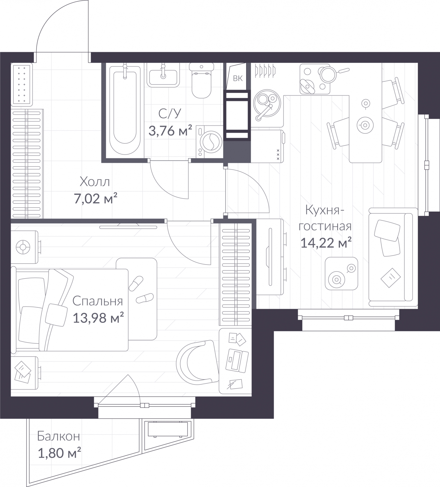 - Жилая площадь 13.98 м²