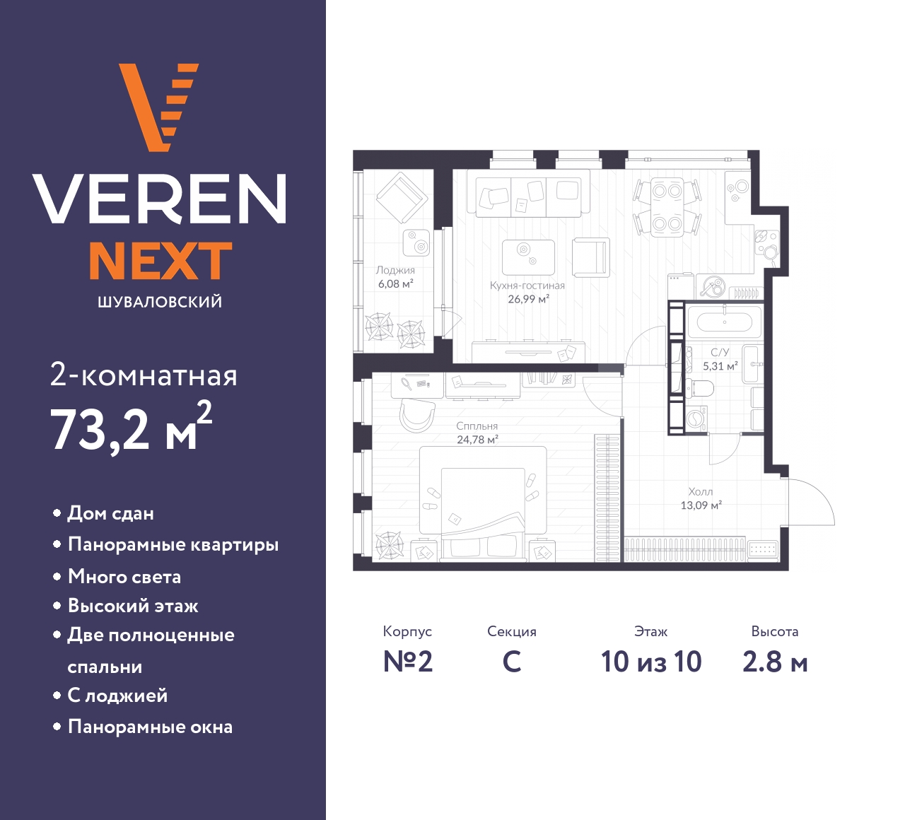 Спешите оформить бронирование, пока действует скидка! Предложение ограничено! Стоимость квартиры указана со скидкой, ваша экономия составит 2,196,000 RUB. По всем вопросам обращайтесь в офис продаж, наши менеджеры вам все расскажут! 2-комн. квартира в ЖК "VEREN NEXT Шуваловский" на 10 этаже. Квартира без отделки, новый собственник может сделать ремонт по индивидуальному проекту. Общая площадь: 73.2 кв.м., жилая: 46.77 кв.м., площадь кухни: 5 кв.м. Квартира угловая, окна oбecпeчивaют paвнoмepнoe ocвeщeниe в тeчeниe дня. В квартире одна лоджия, один совмещенный санузел. Высота потолков 2.8 м. Квартира будет сдана без отделки. Установлены стеклопакеты с повышенной тепло- и шумоизоляцией, установлены элементы отопления, входная дверь, заведены все коммуникации. Вы сможете реализовать свои самые смелые планы дизайн-проекта. Дом монолитный, двухподъездный, высотой 10 этажей. Квартира находится в 1-й секции в корпусе 2. В подъезде 1 грузовой лифт. Начало строительства - 4 квартал 2019 года. Строительство окончено, дом сдан в 3 квартале 2023 года. Оформление сделки по договору купли-продажи. С лоджией, панорамные окна, высокий этаж, много света , вид на приватный двор. ЖК "VEREN NEXT шуваловский" - жилой комплекс комфорт‑класса, расположенный в Приморском районе Санкт-Петербурга. Дома с выразительной авторской архитектурой от именитого бюро «Студия 44». Смело сочетая материалы и формы, архитекторы разработали эффектный и запоминающийся проект, который разительно отличается от представленных в окружении. Отделка фасадов отдаёт дань одновременно и традициям, и трендам. На каждом этаже находится не более 7 квартир. Наши специалисты разработали 47 различных типов планировочных решений, каждое из которых продумано с учетом требований эргономики и функциональности, где нет бесполезной площади. Общее для всех вариантов — увеличенные оконные проемы, а во многих комнатах сразу по два окна, что обеспечивает естественное освещение и ощущение простора. На верхних этажах располагаются квартиры с панорамным остеклением. Ещё больше света и панорамных видов — для тех, кто ценит красоту каждого дня! Красивые парадные с витражным остеклением созданы по индивидуальному дизайн-проекту. В приватном благоустроенном дворе VEREN NEXT Шуваловский найдется место и для детских игр, и для спортивных тренировок на свежем воздухе, и для спокойного отдыха. Пространство здесь спланировано так, чтобы взрослые и малыши проводили время с комфортом. На территории комплекса предусмотрен собственный детский сад. Этот дом красив снаружи и комфортен изнутри. Правильное благоустройство и зонирование позволят каждому жильцу дома комфортно проводить свой досуг. Доступ на территорию комплекса закрыт, а пропускная система позволяет почувствовать себя дома ещё до того, как вы поднимитесь в квартиру. Здесь есть всё, чтобы сэкономить время: магазины, кафе, разнообразные бытовые услуги, подземный паркинг, колясочные и кладовые. ЖК "VEREN NEXT шуваловский" расположен в одной из самых востребованных новоселами локаций города. Здесь чистые широкие улицы, новые дома, развитая инфраструктура, парки и озёра, множество возможностей для отдыха и шопинга. Рядом крупные проспекты, несколько станций метро на разных ветках, рядом КАД и ЗСД, неподалёку — федеральная трасса «Скандинавия». На автомобиле 12 минут до метро и ЗСД, 8 минут до КАД. 