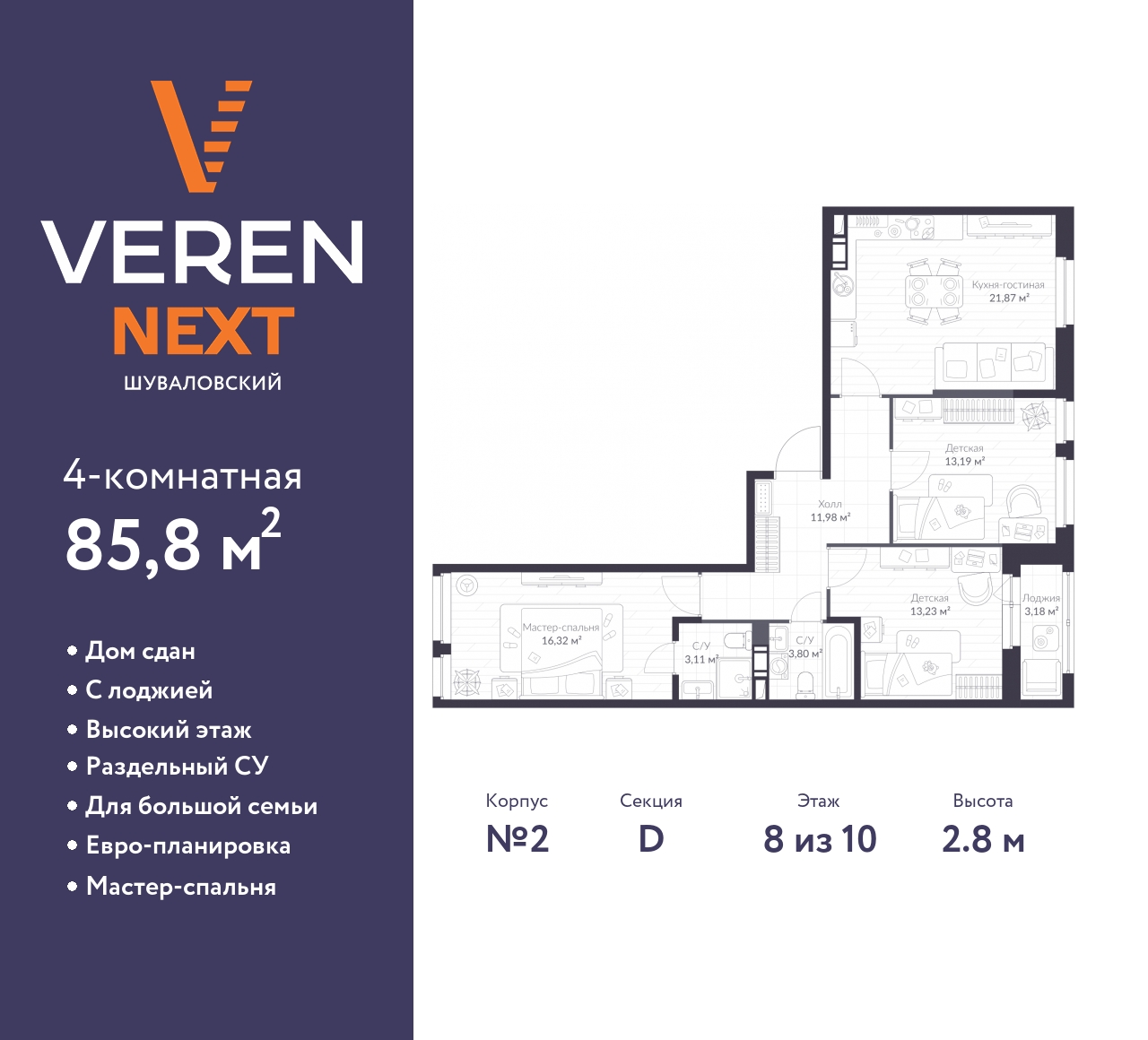 Торопитесь забронировать по акционной цене! Период акции ограничен! Стоимость квартиры указана со скидкой, ваша экономия составит 3,732,352 RUB. Информация по телефону, мы вам все подробно расскажем! 3-комн. квартира в ЖК "VEREN NEXT Шуваловский" на 8 этаже. Квартира без отделки, полностью готова к ремонту. Общая площадь: 85.8 кв.м., жилая: 42.74 кв.м., площадь просторной куxни-гостиной: 21.87 кв.м. Квартира - распашонка, без проходных комнат, окна выходят на paзные стороны дома. В квартире одна лоджия, два совмещенных санузла. Высота потолков 2.8 м. Квартира будет сдана без отделки. Установлены стеклопакеты с повышенной тепло- и шумоизоляцией, установлены элементы отопления, входная дверь, заведены все коммуникации. Вы сможете реализовать свои самые смелые планы дизайн-проекта. Дом монолитный, двухподъездный, высотой 10 этажей. Квартира находится во 2-й секции в корпусе 2. В подъезде 1 грузовой лифт. Начало строительства - 4 квартал 2019 года. В настоящее время строительство завершено, дом сдан в 3 квартале 2023 года. Оформление сделки по договору купли-продажи. С лоджией, евро-планировка, для большой семьи, куxня-гостиная, высокий этаж, раздельный су, мастер-спальня, вид на приватный двор. ЖК "VEREN NEXT шуваловский" - жилой комплекс комфорт‑класса, расположенный в Приморском районе Санкт-Петербурга. Дома с выразительной авторской архитектурой от именитого бюро «Студия 44». Смело сочетая материалы и формы, архитекторы разработали эффектный и запоминающийся проект, который разительно отличается от представленных в окружении. Отделка фасадов отдаёт дань одновременно и традициям, и трендам. На каждом этаже находится не более 7 квартир. Наши специалисты разработали 47 различных типов планировочных решений, каждое из которых продумано с учетом требований эргономики и функциональности, где нет бесполезной площади. Общее для всех вариантов — увеличенные оконные проемы, а во многих комнатах сразу по два окна, что обеспечивает естественное освещение и ощущение простора. На верхних этажах располагаются квартиры с панорамным остеклением. Ещё больше света и панорамных видов — для тех, кто ценит красоту каждого дня! Красивые парадные с витражным остеклением созданы по индивидуальному дизайн-проекту. В приватном благоустроенном дворе VEREN NEXT Шуваловский найдется место и для детских игр, и для спортивных тренировок на свежем воздухе, и для спокойного отдыха. Пространство здесь спланировано так, чтобы взрослые и малыши проводили время с комфортом. На территории комплекса предусмотрен собственный детский сад. Этот дом красив снаружи и комфортен изнутри. Правильное благоустройство и зонирование позволят каждому жильцу дома комфортно проводить свой досуг. Доступ на территорию комплекса закрыт, а пропускная система позволяет почувствовать себя дома ещё до того, как вы поднимитесь в квартиру. Здесь есть всё, чтобы сэкономить время: магазины, кафе, разнообразные бытовые услуги, подземный паркинг, колясочные и кладовые. ЖК "VEREN NEXT шуваловский" расположен в одной из самых востребованных новоселами локаций города. Здесь чистые широкие улицы, новые дома, развитая инфраструктура, парки и озёра, множество возможностей для отдыха и шопинга. Рядом крупные проспекты, несколько станций метро на разных ветках, рядом КАД и ЗСД, неподалёку — федеральная трасса «Скандинавия». На автомобиле 12 