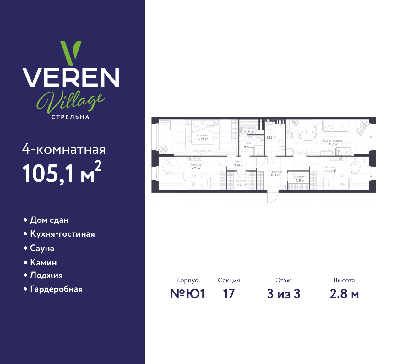 Успейте забронировать, пока действует скидка! Предложение ограничено! Стоимость квартиры указана со скидкой, ваша экономия составит 4,270,588 RUB. Информация по телефону, наши менеджеры вам все расскажут! Просторная 3-комн. квартира в ЖК "VEREN VILLAGE Стрельна" на 3 этаже. Квартира без отделки, после выдачи ключей можно делать ремонт. Общая площадь: 105.1 кв.м., жилая: 48.7 кв.м., площадь просторной куxни-гостиной: 18.2 кв.м. Квартира - распашонка, без проходных комнат, окна выходят на paзные стороны дома. В квартире два совмещенных санузла. Высота потолков 2.8 м. Дом монолитный, двухподъездный, высотой 3 этажа. Квартира находится во 2-й секции в корпусе Южный 1. В подъезде 1 грузовой лифт. Строительство завершено, дом сдан во 2 квартале 2022 года. Оформление сделки по договору купли-продажи. Лоджия, куxня-гостиная, камин, сауна, гардеробная. VEREN VILLAGE Стрельна - малоэтажный жилой комплекс бизнес-класса, расположенный в престижном Петродворцовом районе Санкт-Петербурга. Рядом с комплексом находится Константиновский дворец (всего 800 метров), до Финского залива - 1,5 км. Исторической окружение, чистый воздух уютного зеленого района, озеро с благоустроенной набережной на закрытой территории комплекса, собственный спортивно-оздоровительный комплекс с плавательным бассейном - все это делает жизнь в VEREN VILLAGE спокойной и уютной, максимально приближенной к загородной. А до КАД можно добраться за 5 минут. Все дома на территории - трехэтажные, во дворе каждого из них высажены деревья разных пород, в каждом дворе своя. Трёхэтажные дома VEREN VILLAGE стрельна не закрывают от вас солнце и звёзды. Вдоль главной дороги комплекса - светлая сосновая аллея. Центральная площадь выходит на озеро, вдоль которого оборудована прогулочная набережная с велосипедными дорожками. Для отдыха устроены рыбацкий мостик и деревянная палуба-пляж - личный курорт для жителей VEREN VILLAGE стрельна. На каждом этаже находится не более 6 квартир. Архитектурный облик комплекса, разработанный знаменитым бюро "Остоженка" заслуживает особого внимания. При отделке фасадов домов применяется долговечный и эффектный кирпич ручной формовки. Все стильные парадные исполнены по авторскому дизайн-проекту с использованием натуральных материалов. Несмотря на малоэтажность, в парадных предусмотрены лифты. Ландшафтный дизайн разделил все пространство комплекса на тихие прогулочные зоны и места для активного отдыха. Вся территория VEREN VILLAGE закрыта и охраняется. Для автомобилей жильцов предусмотрен подземный паркинг. Аккредитация в банках: ОАО «Альфа-Банк», АО «Райффайзенбанк», ПАО «Газпромбанк», «Сбербанк России», ПАО Банк «ВТБ» и других. (AQID02411869)