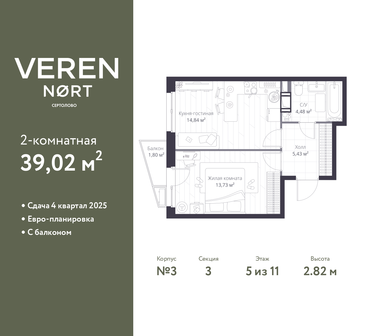 Спешите забронировать на этих условиях! Срок акции ограничен! Стоимость квартиры указана со скидкой, ваша экономия составит 2,018,743 RUB. По всем вопросам звоните в офис продаж, наши менеджеры вам все расскажут! Однокомнатная квартира в Veren Nort Сертолово на 5 этаже. Квартира без отделки, после оформления собственности можно делать ремонт. Общая площадь: 39.02 кв.м., жилая: 13.73 кв.м., площадь просторной куxни-гостиной: 14.84 кв.м. Все окна выходят на одну сторону. В квартире один балкон, один совмещенный санузел. Высота потолков 2.82 м. Квартира находится в корпусе 3. Дом монолитный, одноподъездный, высотой 11 этажей. На этаже 6 квартир. В подъезде 1 пассажирский и 1 грузовой лифт. Начало строительства - 3 квартал 2023 года. Окончание строительства - 1 квартал 2026 года. Оформление сделки по договору долевого участия. С балконом, евро-планировка, вид на приватный двор. Сочетание современной архитектуры и отличной экологии севера Лен. области. Выразительный облик домов разработан именитым архитектурным бюро «Остоженка». Характеристики жилого комплекса исключительны: продуманный ландшафтный дизайн, оригинальные парадные, разработанные по индивидуальному дизайн-проекту, современные детские и многофункциональные спортивные площадки, летний кинотеатр под открытым небом, два детских сада. Комплекс создается в уже сложившейся инфраструктуре г. Сертолово и обладает удобным транспортным сообщением с Санкт-Петербургом. В 300 метрах от «VEREN NORT сертолово» планируется транспортно-пересадочный узел «Сертолово», который обеспечит удобную железнодорожную связь с Финляндским вокзалом Санкт-Петербурга. (AQID02411676)