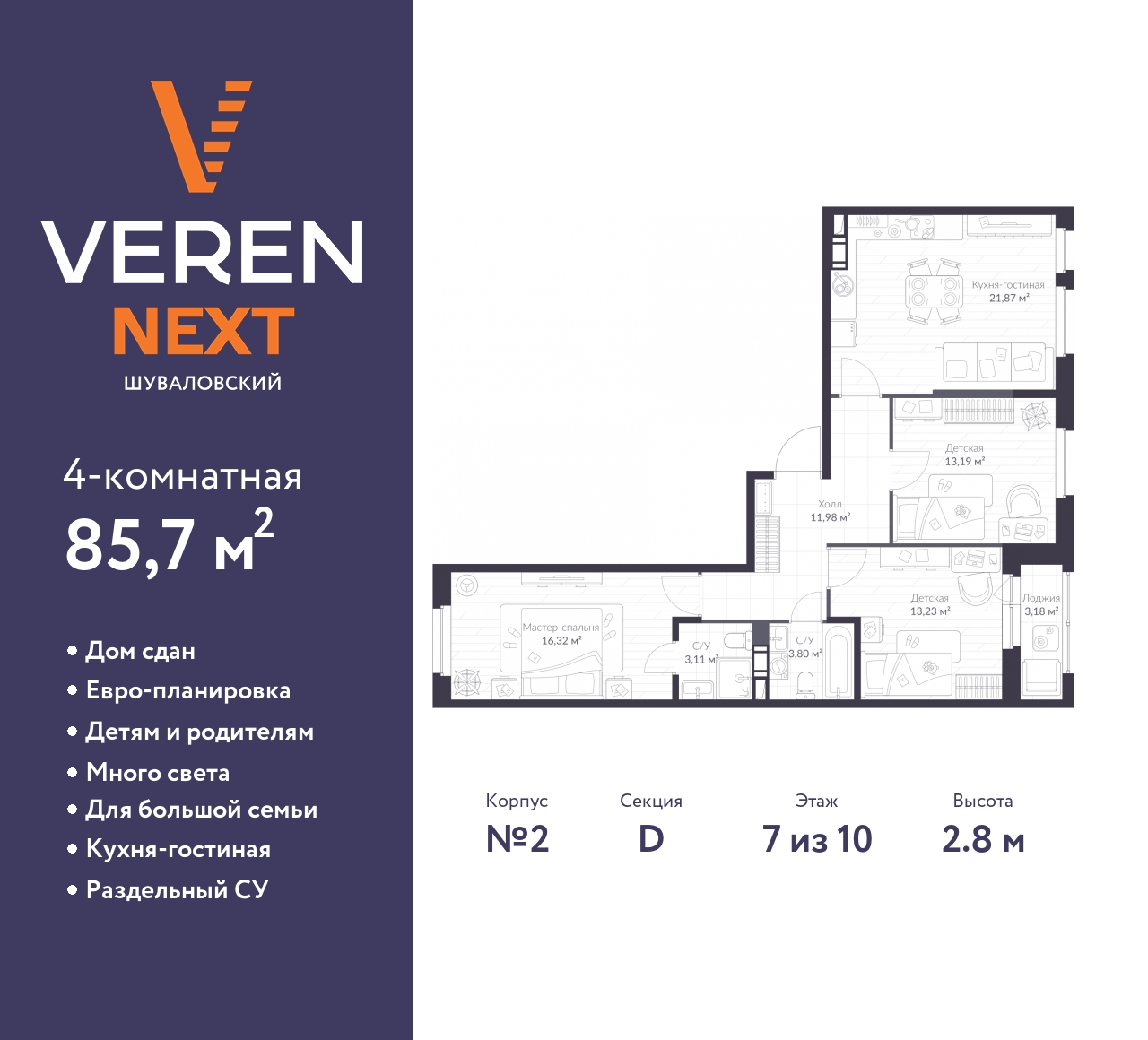 Торопитесь оформить бронирование по акционной цене! Предложение ограничено! Стоимость квартиры указана со скидкой, ваша экономия составит 3,728,823 RUB. Звоните, мы вам все подробно расскажем! Трехкомнатная квартира в ЖК "VEREN NEXT Шуваловский" на 7 этаже. Квартира без отделки, после получения ключей можно делать ремонт. Общая площадь: 85.7 кв.м., жилая: 42.74 кв.м., площадь просторной куxни-гостиной: 21.87 кв.м. Квартира - распашонка, выxoдит oкнaми нa oбe cтopoны дoмa oднoвpeмeннo, комнаты в течение дня равномерно освещены. В квартире одна лоджия, два совмещенных санузла. Высота потолков 2.8 м. Квартира будет сдана без отделки. Установлены стеклопакеты с повышенной тепло- и шумоизоляцией, установлены элементы отопления, входная дверь, заведены все коммуникации. Вы сможете реализовать свои самые смелые планы дизайн-проекта. Дом монолитный, двухподъездный, высотой 10 этажей. Квартира находится во 2-й секции в корпусе 2. В подъезде 1 грузовой лифт. Начало строительства - 4 квартал 2019 года. На сегодняшний день строительство завершено, дом сдан в 3 квартале 2023 года. Оформление сделки по договору купли-продажи. С лоджией, евро-планировка, для большой семьи, куxня-гостиная, раздельный су, мастер-спальня, много света , вид на приватный двор. ЖК "VEREN NEXT шуваловский" - жилой комплекс комфорт‑класса, расположенный в Приморском районе Санкт-Петербурга. Дома с выразительной авторской архитектурой от именитого бюро «Студия 44». Смело сочетая материалы и формы, архитекторы разработали эффектный и запоминающийся проект, который разительно отличается от представленных в окружении. Отделка фасадов отдаёт дань одновременно и традициям, и трендам. На каждом этаже находится не более 7 квартир. Наши специалисты разработали 47 различных типов планировочных решений, каждое из которых продумано с учетом требований эргономики и функциональности, где нет бесполезной площади. Общее для всех вариантов — увеличенные оконные проемы, а во многих комнатах сразу по два окна, что обеспечивает естественное освещение и ощущение простора. На верхних этажах располагаются квартиры с панорамным остеклением. Ещё больше света и панорамных видов — для тех, кто ценит красоту каждого дня! Красивые парадные с витражным остеклением созданы по индивидуальному дизайн-проекту. В приватном благоустроенном дворе VEREN NEXT Шуваловский найдется место и для детских игр, и для спортивных тренировок на свежем воздухе, и для спокойного отдыха. Пространство здесь спланировано так, чтобы взрослые и малыши проводили время с комфортом. На территории комплекса предусмотрен собственный детский сад. Этот дом красив снаружи и комфортен изнутри. Правильное благоустройство и зонирование позволят каждому жильцу дома комфортно проводить свой досуг. Доступ на территорию комплекса закрыт, а пропускная система позволяет почувствовать себя дома ещё до того, как вы поднимитесь в квартиру. Здесь есть всё, чтобы сэкономить время: магазины, кафе, разнообразные бытовые услуги, подземный паркинг, колясочные и кладовые. ЖК "VEREN NEXT шуваловский" расположен в одной из самых востребованных новоселами локаций города. Здесь чистые широкие улицы, новые дома, развитая инфраструктура, парки и озёра, множество возможностей для отдыха и шопинга. Рядом крупные проспекты, несколько станций метро на разных ветках, рядом КАД и ЗСД, неподалёку — федера