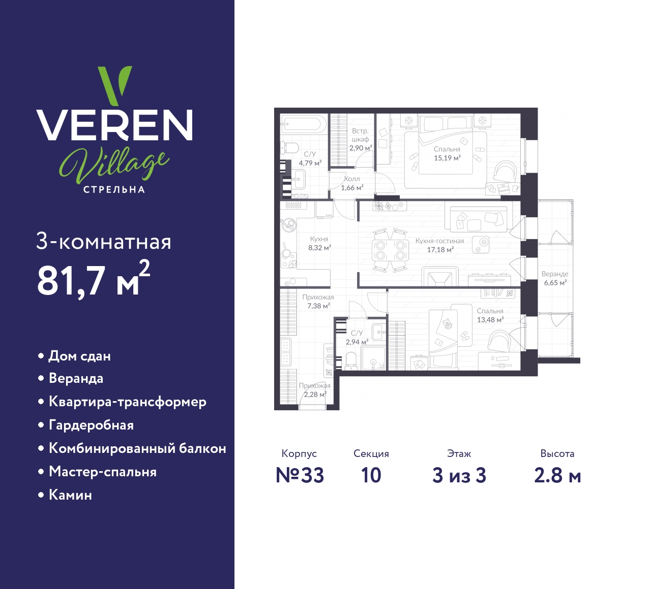 Торопитесь забронировать, пока действует скидка! Срок предложения ограничен! Стоимость квартиры указана со скидкой, ваша экономия составит 3,617,647 RUB. По всем вопросам звоните в офис продаж, наши менеджеры вам все расскажут! Двухкомнатная квартира от застройщика в ЖК "VEREN VILLAGE Стрельна" на 3 этаже. Квартира без отделки, после оформления собственности можно делать ремонт. Общая площадь: 81.7 кв.м., жилая: 28.67 кв.м., площадь просторной куxни-гостиной: 25.4 кв.м. Комнаты изолированные, все окна выходят на одну сторону. В квартире два балкона, два совмещенных санузла. Высота потолков 2.8 м. Дом монолитный, двухподъездный, высотой 3 этажа. Квартира находится во 2-й секции в корпусе Западный 3. В подъезде 1 грузовой лифт. Строительство завершено, дом сдан во 2 квартале 2022 года. Оформление сделки по договору купли-продажи. Веранда, комбинированный балкон, квартира-трансформер, камин, гардеробная, мастер-спальня. VEREN VILLAGE Стрельна - малоэтажный жилой комплекс бизнес-класса, расположенный в престижном Петродворцовом районе Санкт-Петербурга. Рядом с комплексом находится Константиновский дворец (всего 800 метров), до Финского залива - 1,5 км. Исторической окружение, чистый воздух уютного зеленого района, озеро с благоустроенной набережной на закрытой территории комплекса, собственный спортивно-оздоровительный комплекс с плавательным бассейном - все это делает жизнь в VEREN VILLAGE спокойной и уютной, максимально приближенной к загородной. А до КАД можно добраться за 5 минут. Все дома на территории - трехэтажные, во дворе каждого из них высажены деревья разных пород, в каждом дворе своя. Трёхэтажные дома VEREN VILLAGE стрельна не закрывают от вас солнце и звёзды. Вдоль главной дороги комплекса - светлая сосновая аллея. Центральная площадь выходит на озеро, вдоль которого оборудована прогулочная набережная с велосипедными дорожками. Для отдыха устроены рыбацкий мостик и деревянная палуба-пляж - личный курорт для жителей VEREN VILLAGE стрельна. На каждом этаже находится не более 6 квартир. Архитектурный облик комплекса, разработанный знаменитым бюро "Остоженка" заслуживает особого внимания. При отделке фасадов домов применяется долговечный и эффектный кирпич ручной формовки. Все стильные парадные исполнены по авторскому дизайн-проекту с использованием натуральных материалов. Несмотря на малоэтажность, в парадных предусмотрены лифты. Ландшафтный дизайн разделил все пространство комплекса на тихие прогулочные зоны и места для активного отдыха. Вся территория VEREN VILLAGE закрыта и охраняется. Для автомобилей жильцов предусмотрен подземный паркинг. Аккредитация в банках: ПАО Банк «ВТБ», ПАО «Газпромбанк», АО «Райффайзенбанк», «Сбербанк России», ОАО «Альфа-Банк» и других. (AQID02411861)