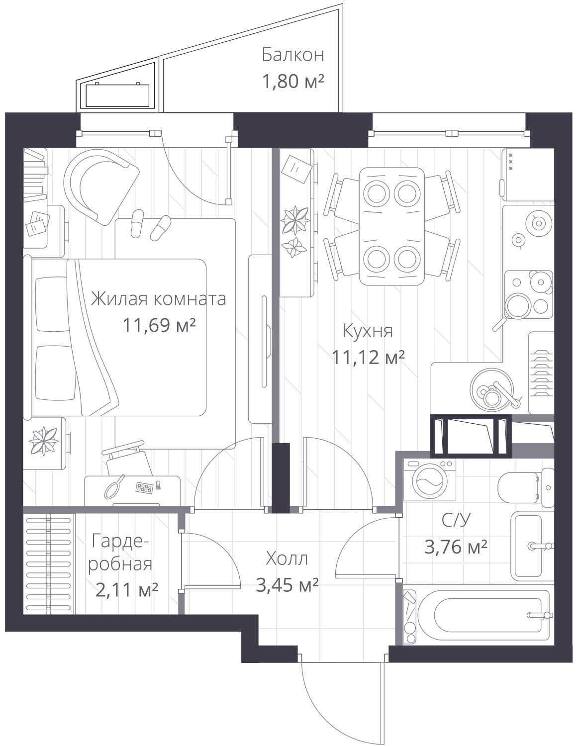 - Жилая площадь 11.7 м²