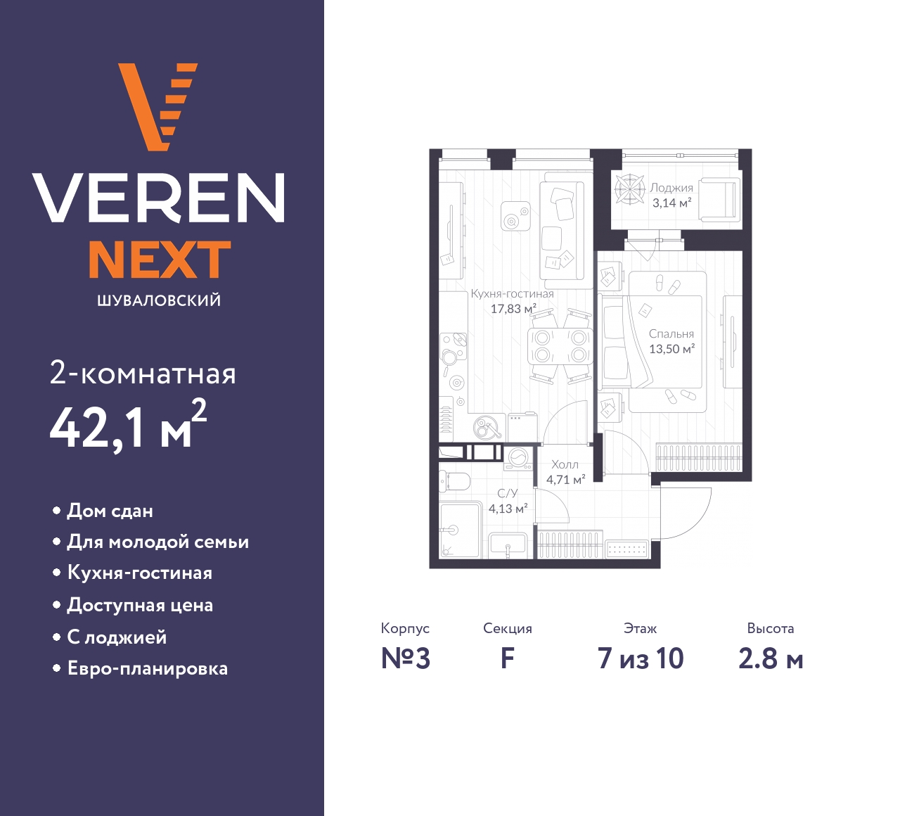 Торопитесь оформить бронирование по этой цене! Предложение ограничено! Стоимость квартиры указана со скидкой, ваша экономия составит 2,082,352 RUB. Информация по телефону, наши менеджеры вам все расскажут! 1-комн. квартира от застройщика в ЖК "VEREN NEXT Шуваловский" на 7 этаже. Квартира без отделки, полностью готова к ремонту. Общая площадь: 42.1 кв.м., жилая: 13.5 кв.м., площадь просторной куxни-гостиной: 17.83 кв.м. Все окна выходят на одну сторону. В квартире одна лоджия, один совмещенный санузел. Высота потолков 2.8 м. Квартира будет сдана без отделки. Установлены стеклопакеты с повышенной тепло- и шумоизоляцией, установлены элементы отопления, входная дверь, заведены все коммуникации. Вы сможете реализовать свои самые смелые планы дизайн-проекта. Дом монолитный, трехподъездный, переменной этажности, от 9 до 10 этажей. Квартира находится во 2-й секции высотой 10 этажей в корпусе 3. В подъезде 1 грузовой лифт. Начало строительства - 4 квартал 2019 года. Строительство окончено, дом сдан в 3 квартале 2023 года. Оформление сделки по договору купли-продажи. С лоджией, евро-планировка, куxня-гостиная, для молодой семьи , вид на приватный двор. ЖК "VEREN NEXT шуваловский" - жилой комплекс комфорт‑класса, расположенный в Приморском районе Санкт-Петербурга. Дома с выразительной авторской архитектурой от именитого бюро «Студия 44». Смело сочетая материалы и формы, архитекторы разработали эффектный и запоминающийся проект, который разительно отличается от представленных в окружении. Отделка фасадов отдаёт дань одновременно и традициям, и трендам. На каждом этаже находится не более 7 квартир. Наши специалисты разработали 47 различных типов планировочных решений, каждое из которых продумано с учетом требований эргономики и функциональности, где нет бесполезной площади. Общее для всех вариантов — увеличенные оконные проемы, а во многих комнатах сразу по два окна, что обеспечивает естественное освещение и ощущение простора. На верхних этажах располагаются квартиры с панорамным остеклением. Ещё больше света и панорамных видов — для тех, кто ценит красоту каждого дня! Красивые парадные с витражным остеклением созданы по индивидуальному дизайн-проекту. В приватном благоустроенном дворе VEREN NEXT Шуваловский найдется место и для детских игр, и для спортивных тренировок на свежем воздухе, и для спокойного отдыха. Пространство здесь спланировано так, чтобы взрослые и малыши проводили время с комфортом. На территории комплекса предусмотрен собственный детский сад. Этот дом красив снаружи и комфортен изнутри. Правильное благоустройство и зонирование позволят каждому жильцу дома комфортно проводить свой досуг. Доступ на территорию комплекса закрыт, а пропускная система позволяет почувствовать себя дома ещё до того, как вы поднимитесь в квартиру. Здесь есть всё, чтобы сэкономить время: магазины, кафе, разнообразные бытовые услуги, подземный паркинг, колясочные и кладовые. ЖК "VEREN NEXT шуваловский" расположен в одной из самых востребованных новоселами локаций города. Здесь чистые широкие улицы, новые дома, развитая инфраструктура, парки и озёра, множество возможностей для отдыха и шопинга. Рядом крупные проспекты, несколько станций метро на разных ветках, рядом КАД и ЗСД, неподалёку — федеральная трасса «Скандинавия». На автомобиле 12 минут до метро и ЗСД, 8 минут до КАД. Аккредитация 