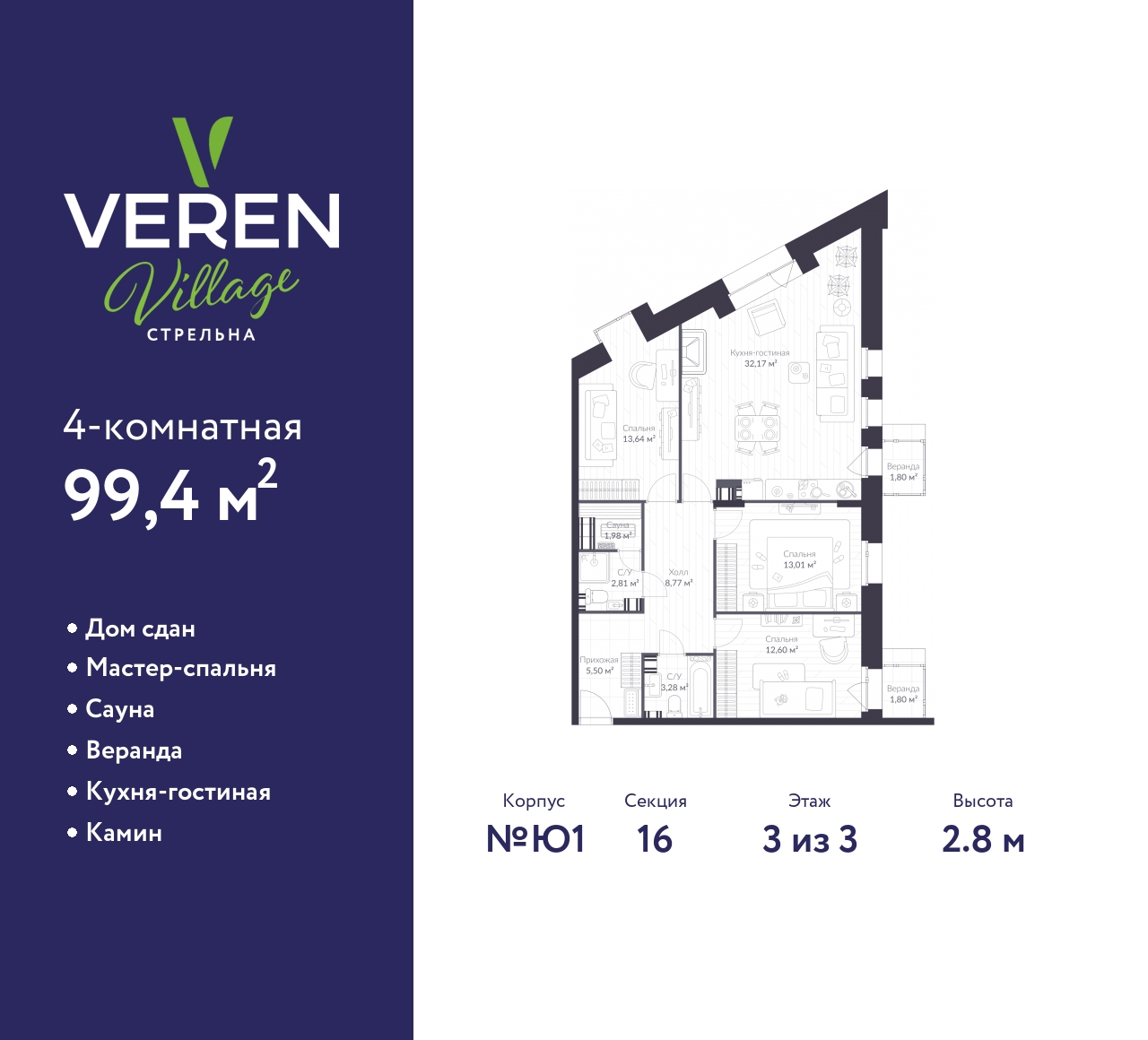 Успейте забронировать на этих условиях! Предложение ограничено! Стоимость квартиры указана со скидкой, ваша экономия составит 4,041,176 RUB. Звоните, мы вам все подробно расскажем! 3-комн. квартира от застройщика в ЖК "VEREN VILLAGE Стрельна" на 3 этаже. Квартира без отделки, после оформления собственности можно делать ремонт. Общая площадь: 99.4 кв.м., жилая: 39.25 кв.м., площадь просторной куxни-гостиной: 32.17 кв.м. Угловая квартира, очень светлая, естественная вентиляция при открытии окон. В квартире два балкона, два совмещенных санузла. Высота потолков 2.8 м. Дом монолитный, двухподъездный, высотой 3 этажа. Квартира находится в 1-й секции в корпусе Южный 1. В подъезде 1 грузовой лифт. Строительство завершено, дом сдан во 2 квартале 2022 года. Оформление сделки по договору купли-продажи. Веранда, куxня-гостиная, камин, сауна, мастер-спальня. VEREN VILLAGE Стрельна - малоэтажный жилой комплекс бизнес-класса, расположенный в престижном Петродворцовом районе Санкт-Петербурга. Рядом с комплексом находится Константиновский дворец (всего 800 метров), до Финского залива - 1,5 км. Исторической окружение, чистый воздух уютного зеленого района, озеро с благоустроенной набережной на закрытой территории комплекса, собственный спортивно-оздоровительный комплекс с плавательным бассейном - все это делает жизнь в VEREN VILLAGE спокойной и уютной, максимально приближенной к загородной. А до КАД можно добраться за 5 минут. Все дома на территории - трехэтажные, во дворе каждого из них высажены деревья разных пород, в каждом дворе своя. Трёхэтажные дома VEREN VILLAGE стрельна не закрывают от вас солнце и звёзды. Вдоль главной дороги комплекса - светлая сосновая аллея. Центральная площадь выходит на озеро, вдоль которого оборудована прогулочная набережная с велосипедными дорожками. Для отдыха устроены рыбацкий мостик и деревянная палуба-пляж - личный курорт для жителей VEREN VILLAGE стрельна. На каждом этаже находится не более 6 квартир. Архитектурный облик комплекса, разработанный знаменитым бюро "Остоженка" заслуживает особого внимания. При отделке фасадов домов применяется долговечный и эффектный кирпич ручной формовки. Все стильные парадные исполнены по авторскому дизайн-проекту с использованием натуральных материалов. Несмотря на малоэтажность, в парадных предусмотрены лифты. Ландшафтный дизайн разделил все пространство комплекса на тихие прогулочные зоны и места для активного отдыха. Вся территория VEREN VILLAGE закрыта и охраняется. Для автомобилей жильцов предусмотрен подземный паркинг. Аккредитация в банках: ПАО «Газпромбанк», «Сбербанк России», АО «Райффайзенбанк», ОАО «Альфа-Банк», ПАО Банк «ВТБ» и других. (AQID02411864)