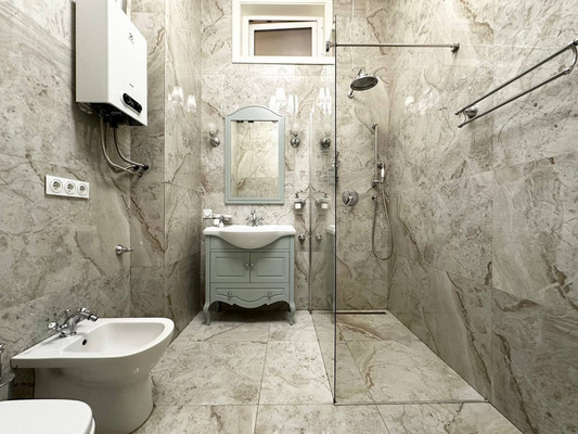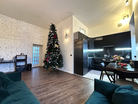 - КУХНЯ - ГОСТИНАЯ с двумя окнами, удобной планировки, которая позволяет разместить всё необходимое в одном пространстве (26 кв. м). Посудомоечная машина есть.-Совмещенный сан.узел (5 кв. м) с просторным размещением стиральной машинки и биде;-ПРИХОЖАЯ (4 кв. м) находится между двумя входными дверями. Это решение обеспечивает комфорт при входе в квартиру, где отдельно хранится верхняя одежда и обувь.