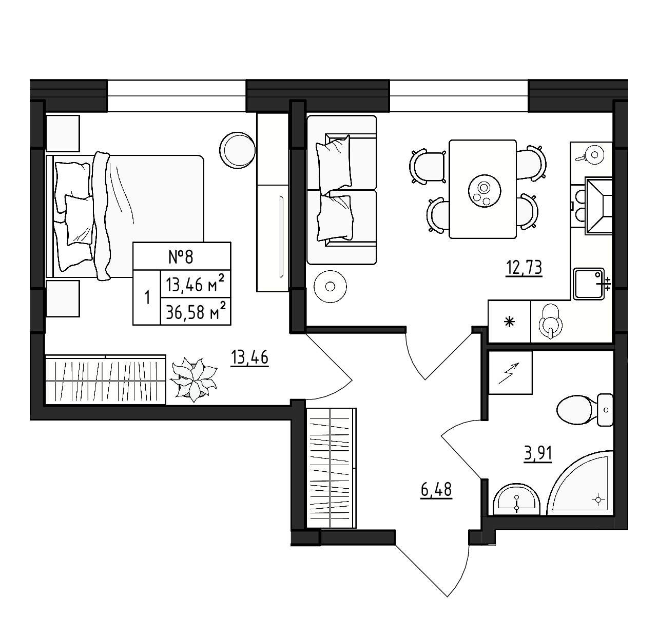 - Жилая площадь 13.46 м²