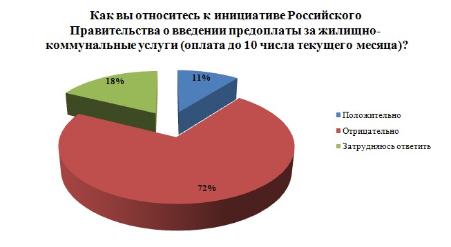 «Я ожидал показателей на уровне 90%. Ведь она прямо противоречит закону о защите прав потребителей – по нему оплачиваться могут только уже оказанные услуги». Депутат приравнивает введение предоплаты за услуги ЖКХ к жилищному налогу, который граждане будут обязаны платить вне зависимости от того, оказали ли им соответствующие услуги.