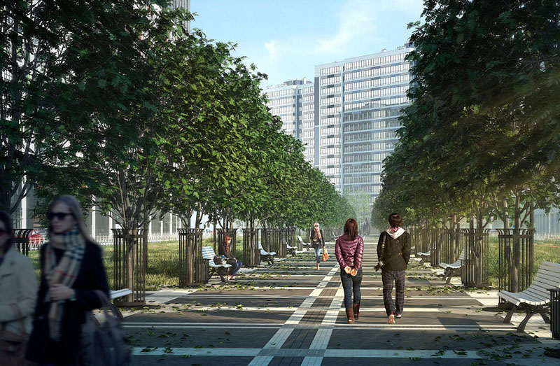 Прогулочную аллею планируется осветить дизайнерскими фонарями. Дорога, разделяющая пешеходное пространство и корпуса жилых домов, будет оборудована безопасными пешеходными переходами, перед каждым переходом будут созданы искусственные неровности для принудительного торможения любого транспорта. Движение по односторонней дороге будет неинтенсивным с низким порогом ограничения скорости, стоянка на дороге запрещена.