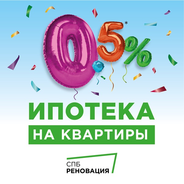 * Ставка в размере 0,5% действует в течение 8 месяцев с даты заключения кредитного договора в случае оформления полного комплексного страхования и первоначальном взносе не менее 20%. Ставка 0,5% обеспечивается за счет субсидирования из средств застройщика ООО «СПб Реновация».