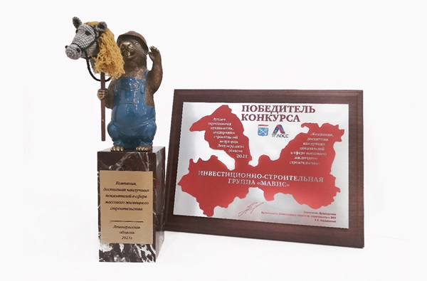 ИСГ «МАВИС» получила почетный диплом и официальную награду конкурса – традиционную статуэтку бобра как символ трудолюбия и мастерства в сфере строительства за победу в номинации «Компания, достигшая наилучших показателей в сфере массового жилищного строительства» по итогам 2021 года.