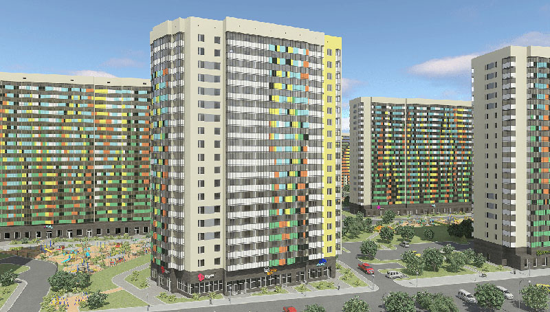 В пятой очереди ЖК «Краски лета» закончены работы по заливке монолитного каркаса, завершается наружная кладка стен и установка окон. Работы по отделке фасада выполнены на более чем 50%.