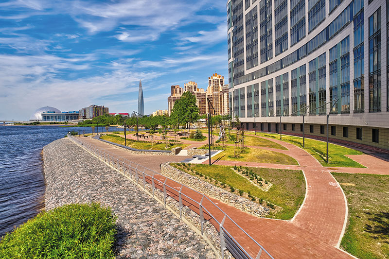 Комплекс расположен в непосредственной близости от воды, и «Группа ЛСР» использовала весь потенциал береговой линии для обустройства прилегающей территории. Здесь высажено 119 деревьев, среди которых дубы, ивы, каштаны, клены, липы, ели, сосны, рябины и яблони, а также более 2000 кустарников роз, сирени, гортензии, барбариса и других видов.