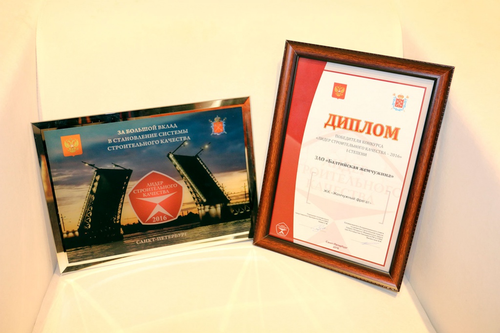 По итогам конкурса жилой квартал комфорт-класса «Жемчужный фрегат»», построенный в квартале «Балтийская жемчужина», завоевал диплом I степени «Лидер строительного качества 2016».