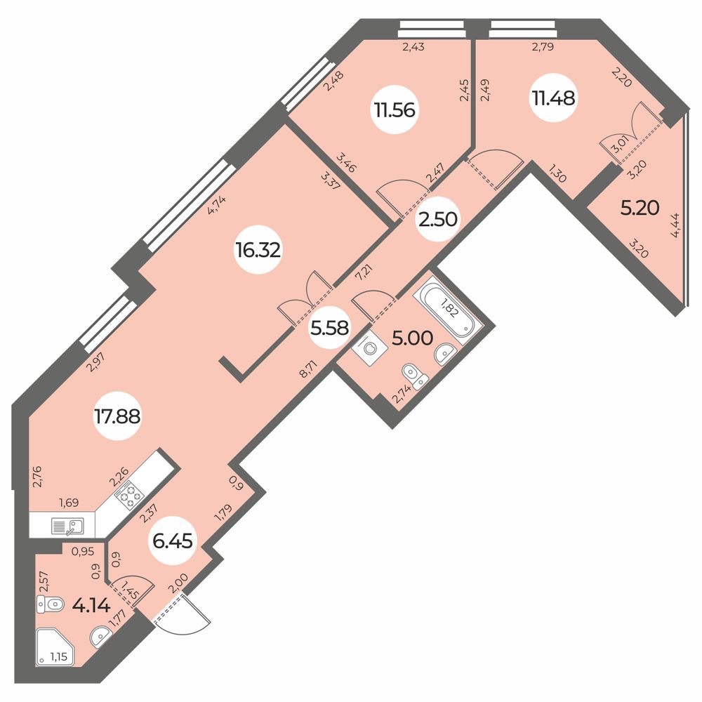 - Площадь кухни 17.88 м²