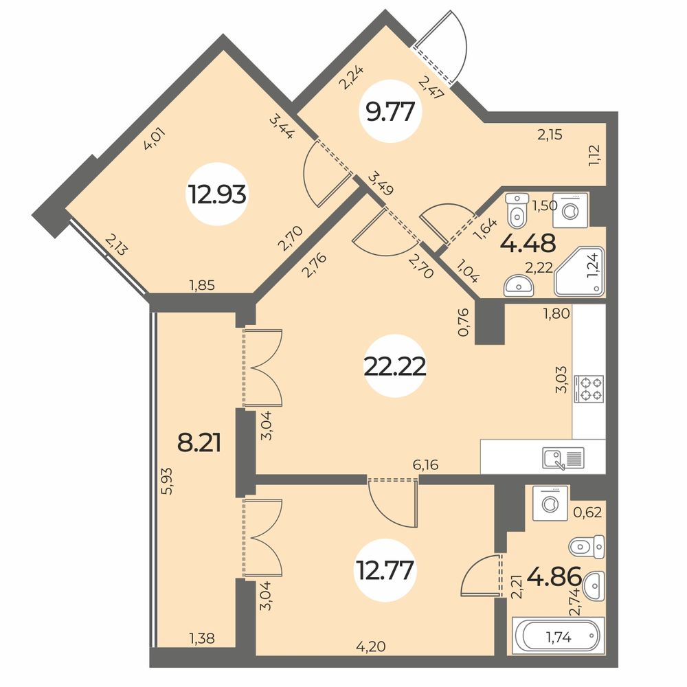 - Площадь кухни 22.22 м²