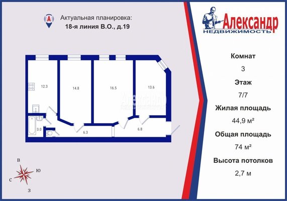 - Жилая площадь 44.9 м²