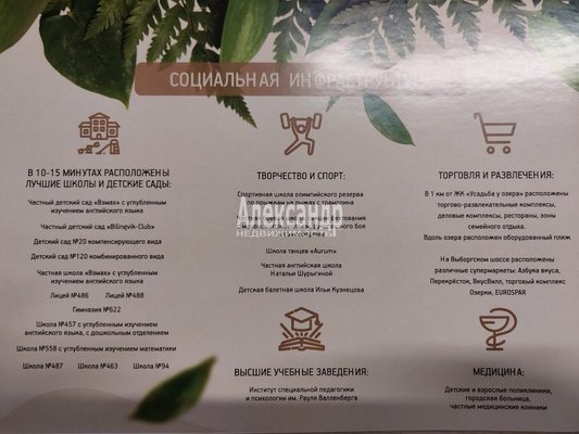 - магазины: «Лента», «EUROSPAR», «ВкусВилл», «Магнит», «Пятерочка» и другие. - рестораны и кафе, скверы, школы, детские сады, поликлиники, спортивные, торговые и развлекательные комплексы.