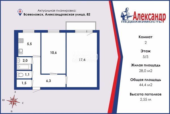 1691603 Предлагается к продаже 2 к.кв в центре Всеволожска, общ.пл. 44,4 кв.м, комнаты 17,4+10,6 кв.м, кухня 5,5 кв.м, 5/5 эт., дом панельный, чистая парадная, есть балкон, стеклопакеты, требуется ремонт, прямая продажа, свободна, никто не прописан. Рядом вся инфраструктура, рынок, сетевые магазины. Хорошее сообщение с СПб. Возможен торг!